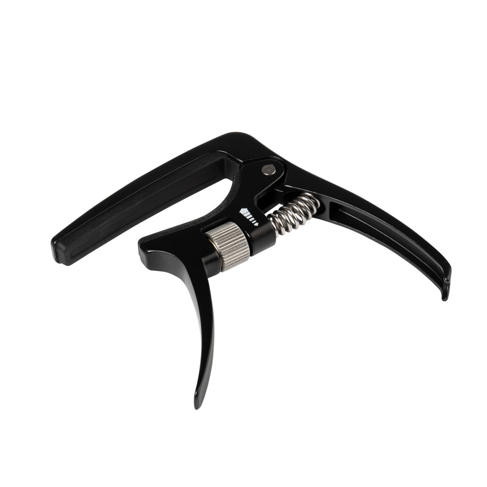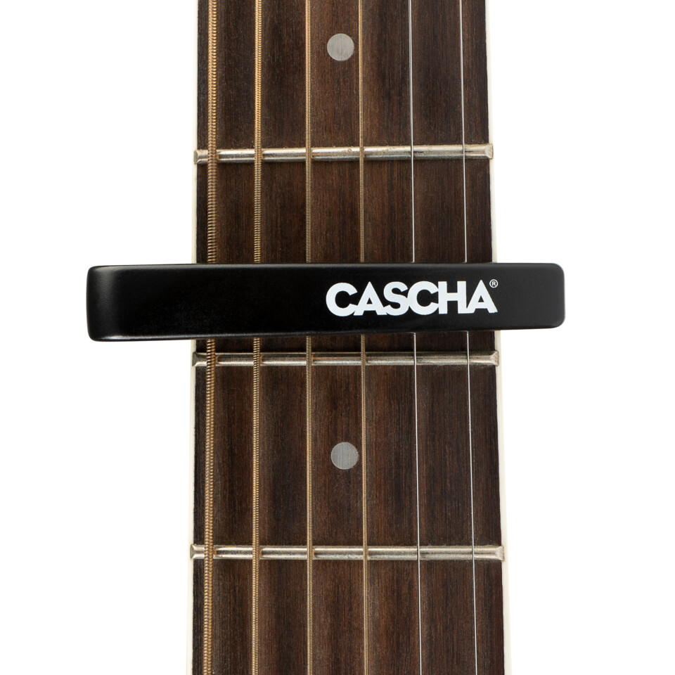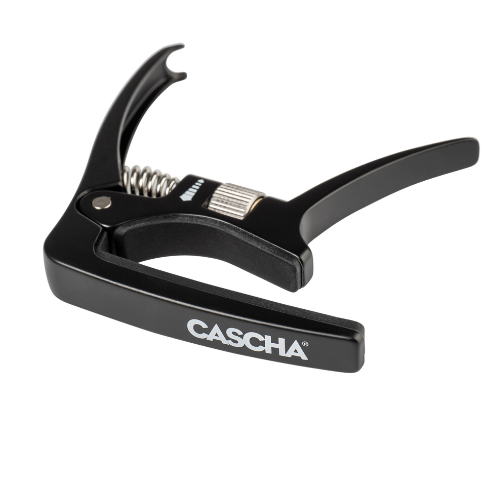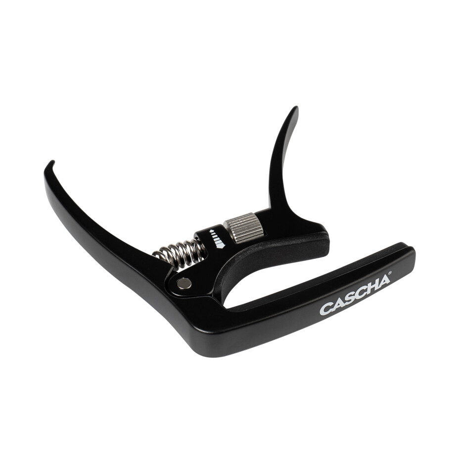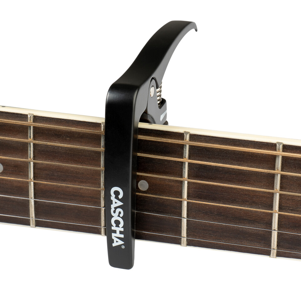Ein Kapodaster ist ein unersetzliches Hilfsmittel für jeden Gitarristen. Mit ihm kann man z.B. die Tonhöhe der Gitarre an die Stimmlage eines Sängers anpassen, ohne den Einsatz komplizierter Barrégriffe. Damit der Kapodaster gut funktioniert, müssen Qualität und Bauweise stimmen, so wie beim Cascha Deluxe Capo. Seine hochwertige Feder aus Qualitätsstahl ist in ihrer Spannung stufenlos einstellbar und sorgt damit für brillante Töne und eine perfekte Intonation beim Spielen, egal ob auf dicken oder dünnen Saiten. Die stabile Metallkonstruktion sitzt in jeder Lage perfekt und ist an den Auflageflächen mit Silikon beschichtet. So werden Hals und Saiten der Gitarre perfekt geschützt. Das Cascha Deluxe Capo lässt sich mit nur einer Hand schnell und einfach anbringen und wieder abnehmen. Dieses Modell ist für Acoustic- und E-Gitarren geeignet.