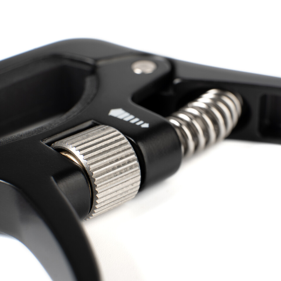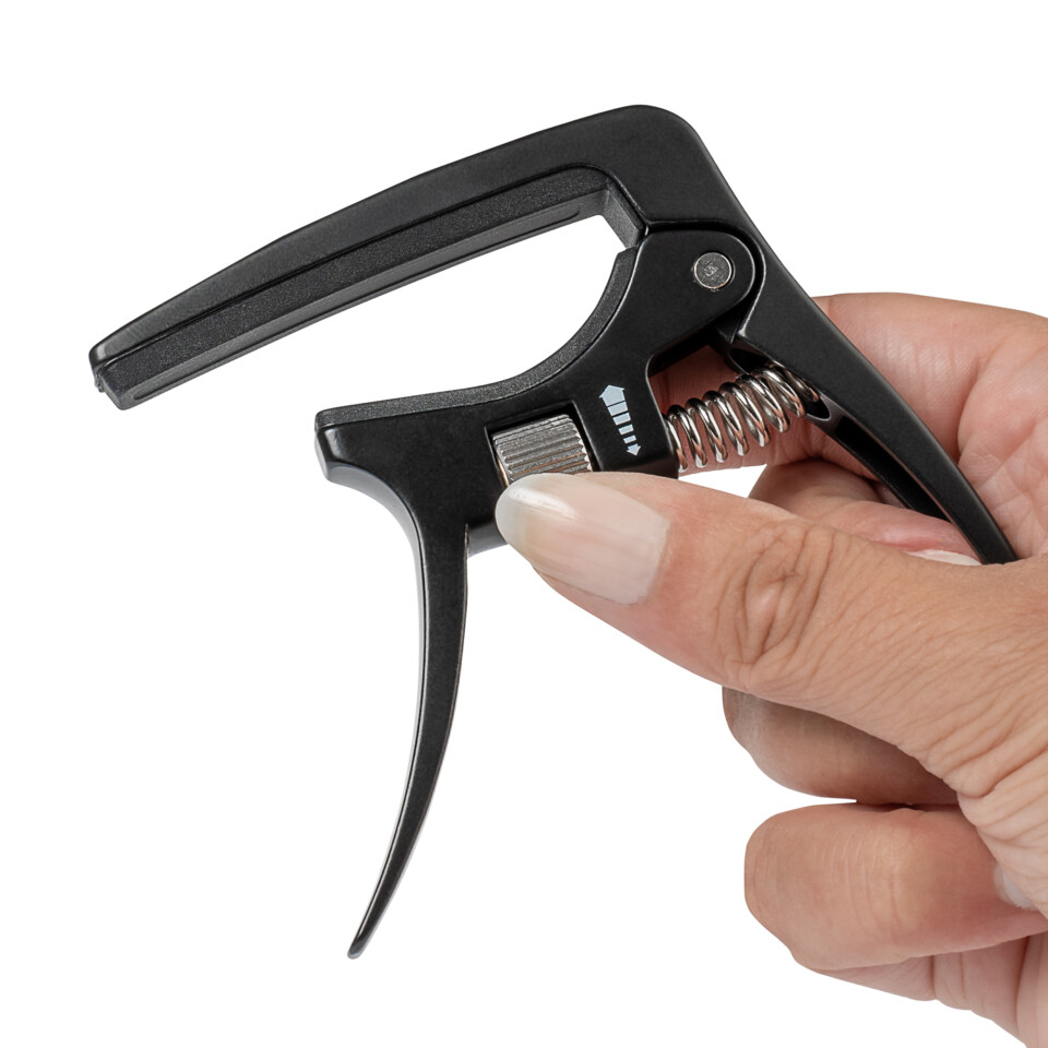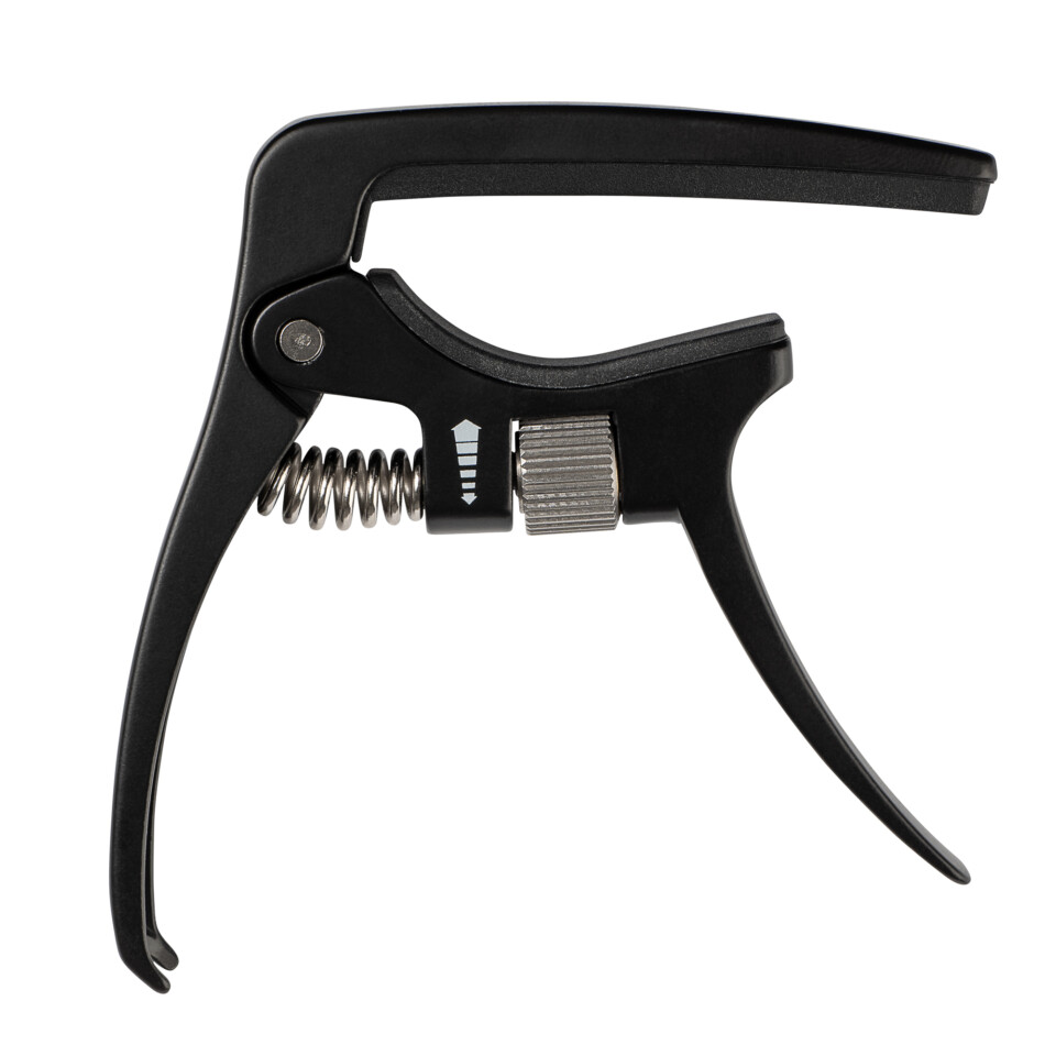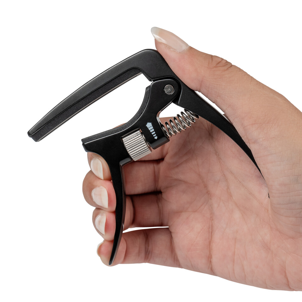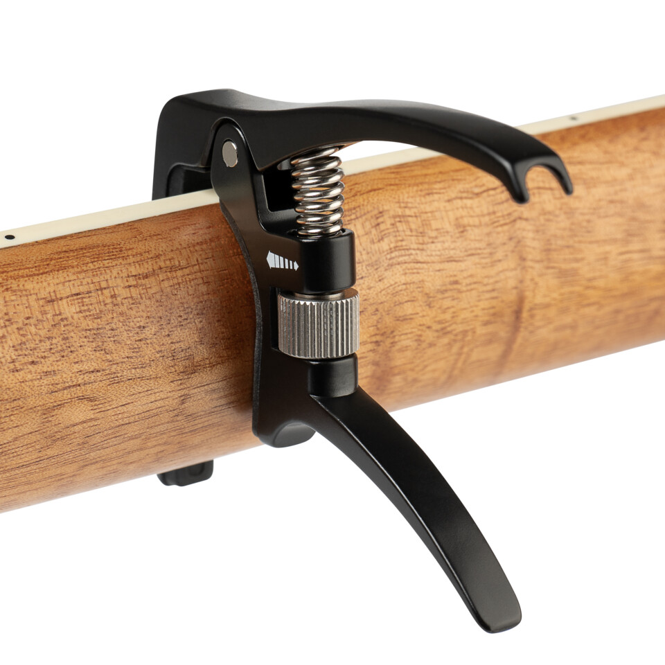 Ein Kapodaster ist ein unersetzliches Hilfsmittel für jeden Gitarristen. Mit ihm kann man z.B. die Tonhöhe der Gitarre an die Stimmlage eines Sängers anpassen, ohne den Einsatz komplizierter Barrégriffe. Damit der Kapodaster gut funktioniert, müssen Qualität und Bauweise stimmen, so wie beim Cascha Deluxe Capo. Seine hochwertige Feder aus Qualitätsstahl ist in ihrer Spannung stufenlos einstellbar und sorgt damit für brillante Töne und eine perfekte Intonation beim Spielen, egal ob auf dicken oder dünnen Saiten. Die stabile Metallkonstruktion sitzt in jeder Lage perfekt und ist an den Auflageflächen mit Silikon beschichtet. So werden Hals und Saiten der Gitarre perfekt geschützt. Das Cascha Deluxe Capo lässt sich mit nur einer Hand schnell und einfach anbringen und wieder abnehmen. Dieses Modell ist für Acoustic- und E-Gitarren geeignet.