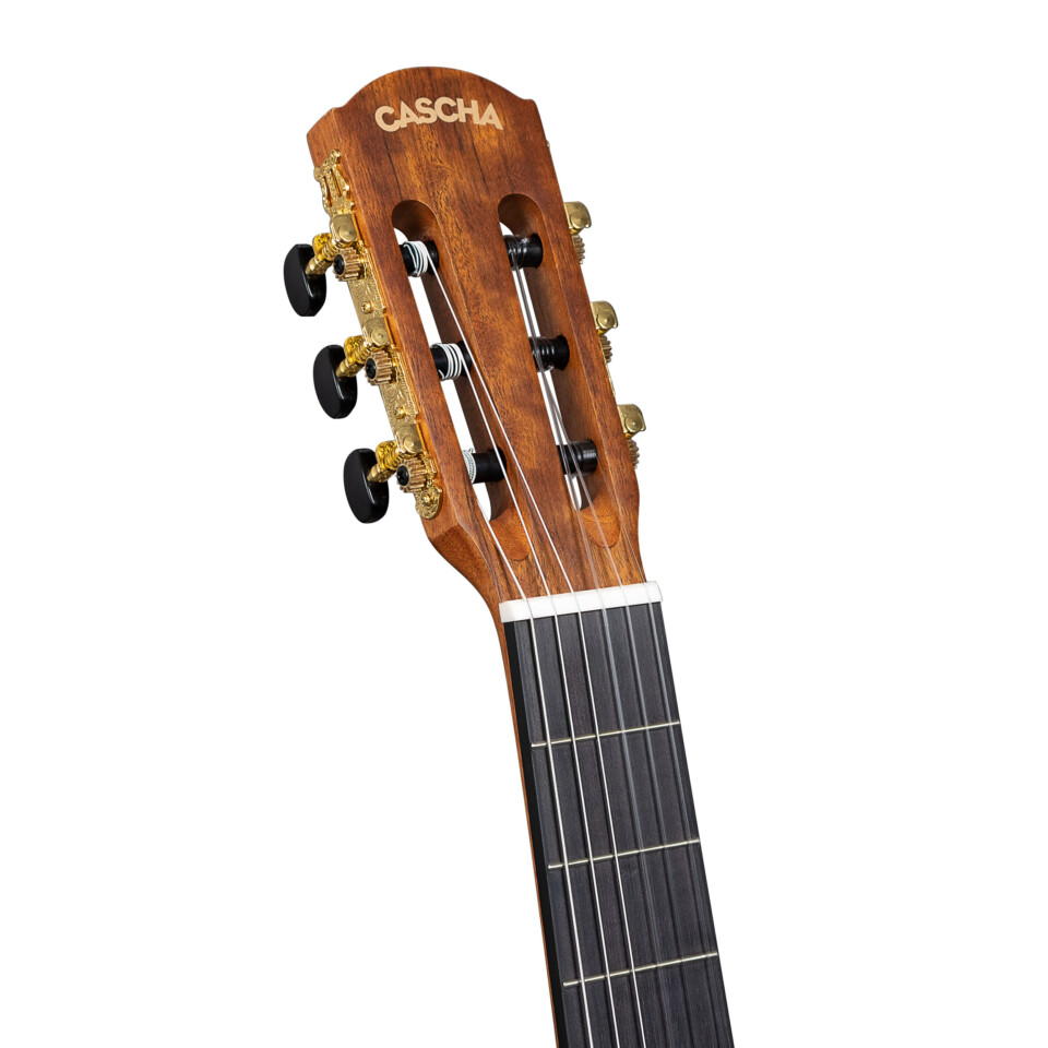Die verwendeten Hölzer sorgen in Kombination nicht nur für hervorragende akustische Eigenschaften, sondern lassen die CASCHA Stage Series CGC 200 3/4 auch optisch glänzen. Die präzisen Stimmmechaniken sorgen für eine hohe Stimmfestigkeit und sind dank der offenen Bauweise mit goldenen Details ein echter Eyecatcher. Die schicke Verzierung am Resonanzloch sorgt zusätzlich für einen traditionellen Look. Wie alle Modelle der CASCHA Stage Series besitzt auch dieses Modell einen eingebauten Halsspannstab, mit dem sich die Saitenlage perfekt einstellen lässt.