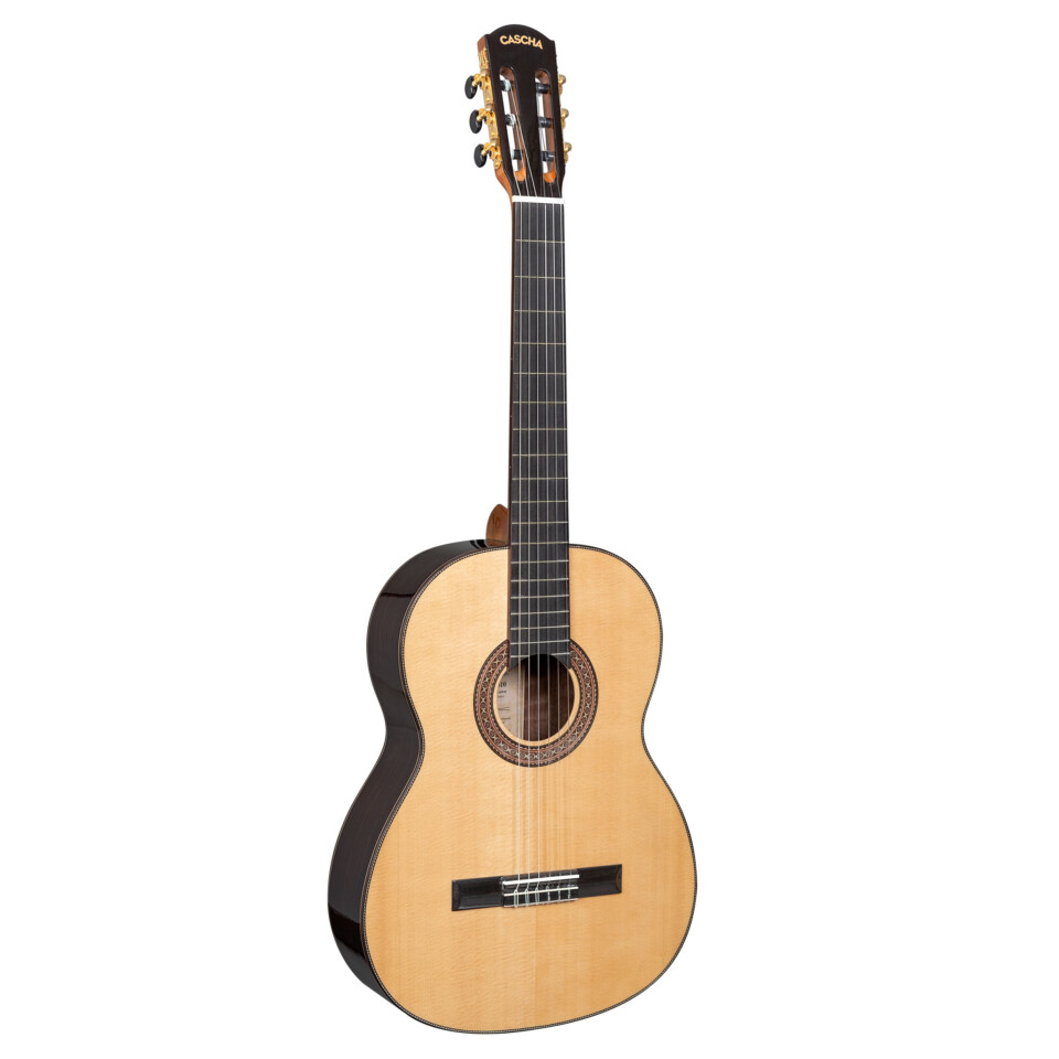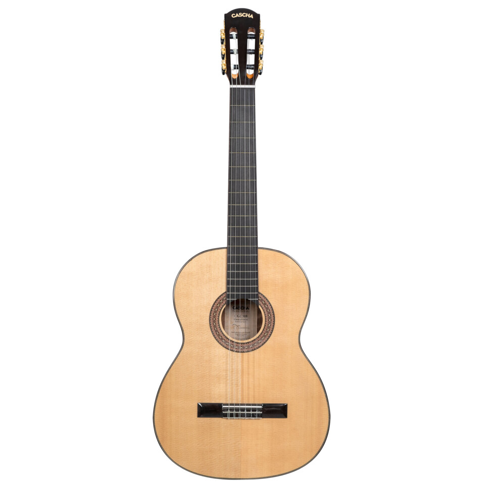 Die CASCHA Performer Series Konzertgitarre Solid Top 4/4 ist eine klassisch geformte Konzertgitarre mit einer Mensurlänge von 65 Zentimetern (39 Zoll). Eine hochwertige Verarbeitung und ausgewählte Klanghölzer sorgen bei der CASCHA Performer-Serie für einen vollen und professionellen Klang. Die Decke der Gitarre besteht aus massivem Fichtenholz für ein langes Sustain, der Boden und die Zarge sind aus Palisander gefertigt, das für kräftige Bässe und brillante Obertöne sorgt. Der Hals ist aus hochwertigem Mahagoni gefertigt, Griffbrett und Steg bestehen aus langlebigem und widerstandsfähigem Amaranth (Purple Heart).