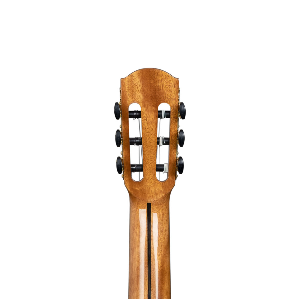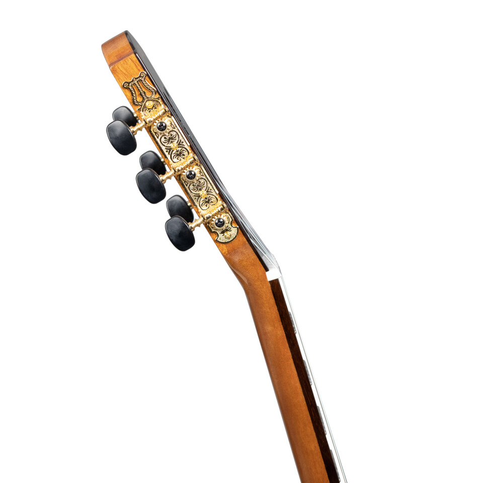 Die verwendeten Hölzer verleihen der CASCHA Performer Series Konzertgitarre Solid Top 4/4 nicht nur überragende akustische Eigenschaften, sondern in Verbindung mit dem Hochglanz-Finish auch einen edlen, traditionellen Look. Dieser wird durch schicke Holz-Inlays am Resonanzloch sowie den Rändern von Decke, Boden und Zarge (sog. Bindings) zusätzlich unterstrichen. Die präzisen Stimmmechaniken sorgen für eine hohe Stimmfestigkeit und sind dank der offenen Bauweise mit goldenen Details ebenfalls ein echter Blickfang. Wie alle Modelle der CASCHA Performer Series besitzt auch dieses Modell einen eingebauten Halsspannstab, mit dem sich die Saitenlage perfekt einstellen lässt.