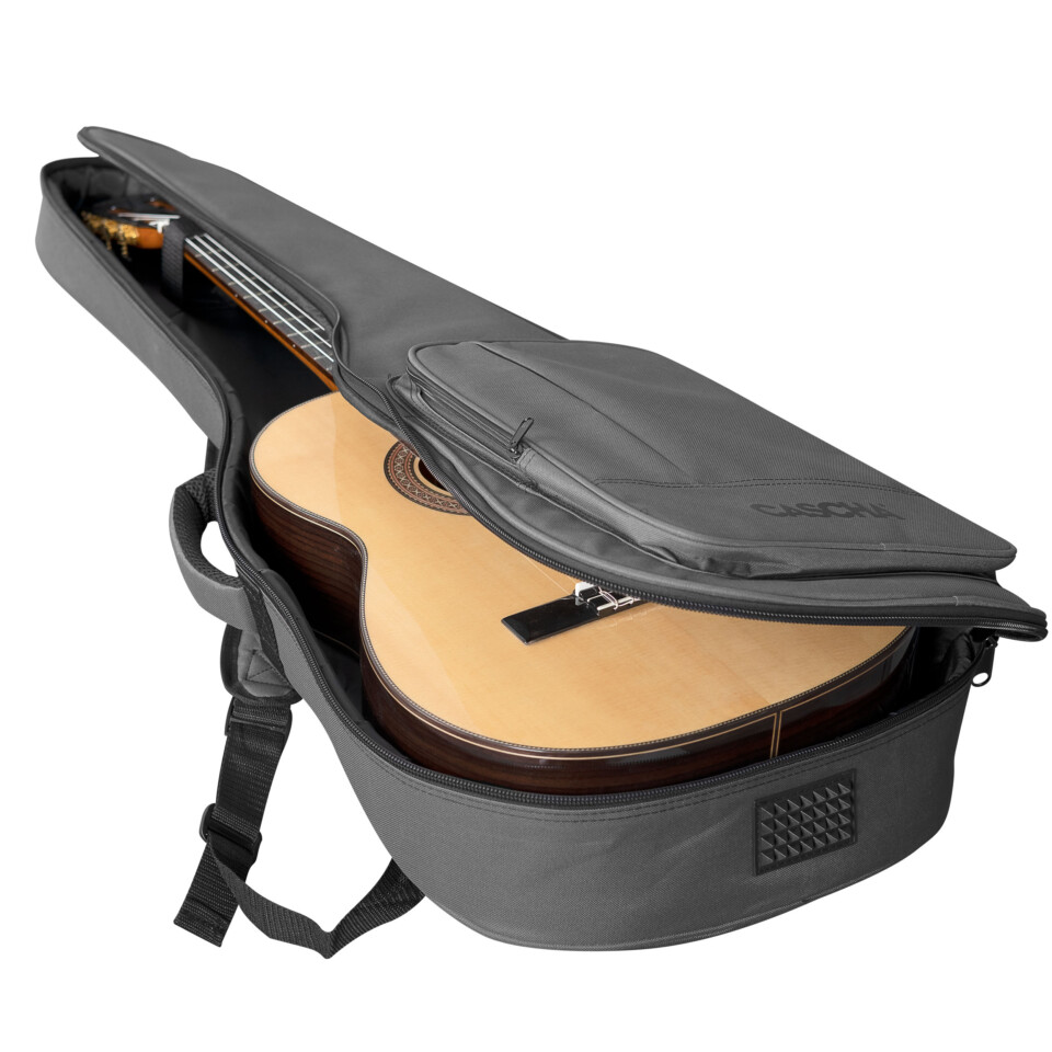 Zum Lieferumfang der CASCHA Performer Series Konzertgitarre Solid Top 4/4 gehört ein graues Deluxe-Gigbag mit einer dicken Innenpolsterung von 8 Millimetern. Somit lässt sich die Gitarre jederzeit sicher verstauen und transportieren – etwa zum Unterricht, zur Probe oder zum Auftritt. Dank des praktischen Außenfachs mit Reißverschluss hat man auch Zubehör wie Stimmgerät, Plektren oder Notenblätter immer und überall dabei.