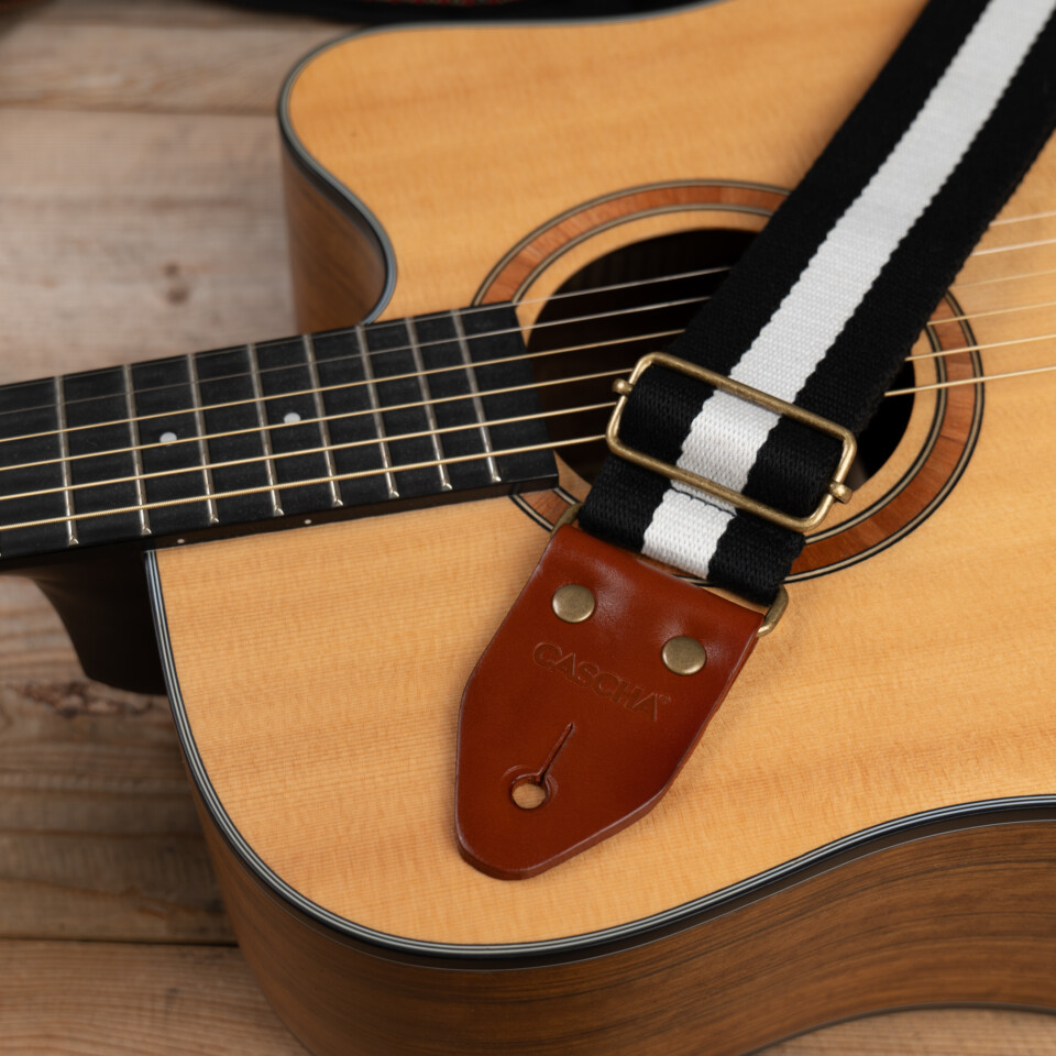 Die Cascha Guitar Straps ermöglichen dem Spieler, seine Gitarre über die Schulter zu hängen, was die Ermüdung der Arme reduziert und längeres Spielen ermöglicht.