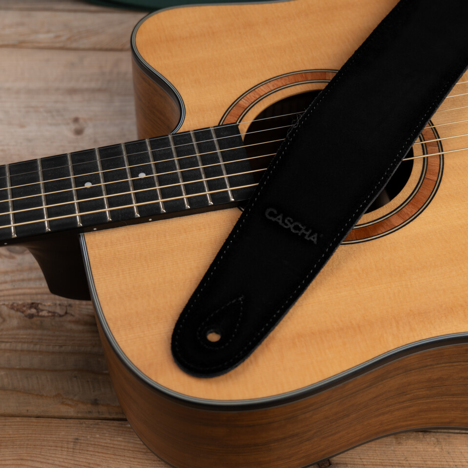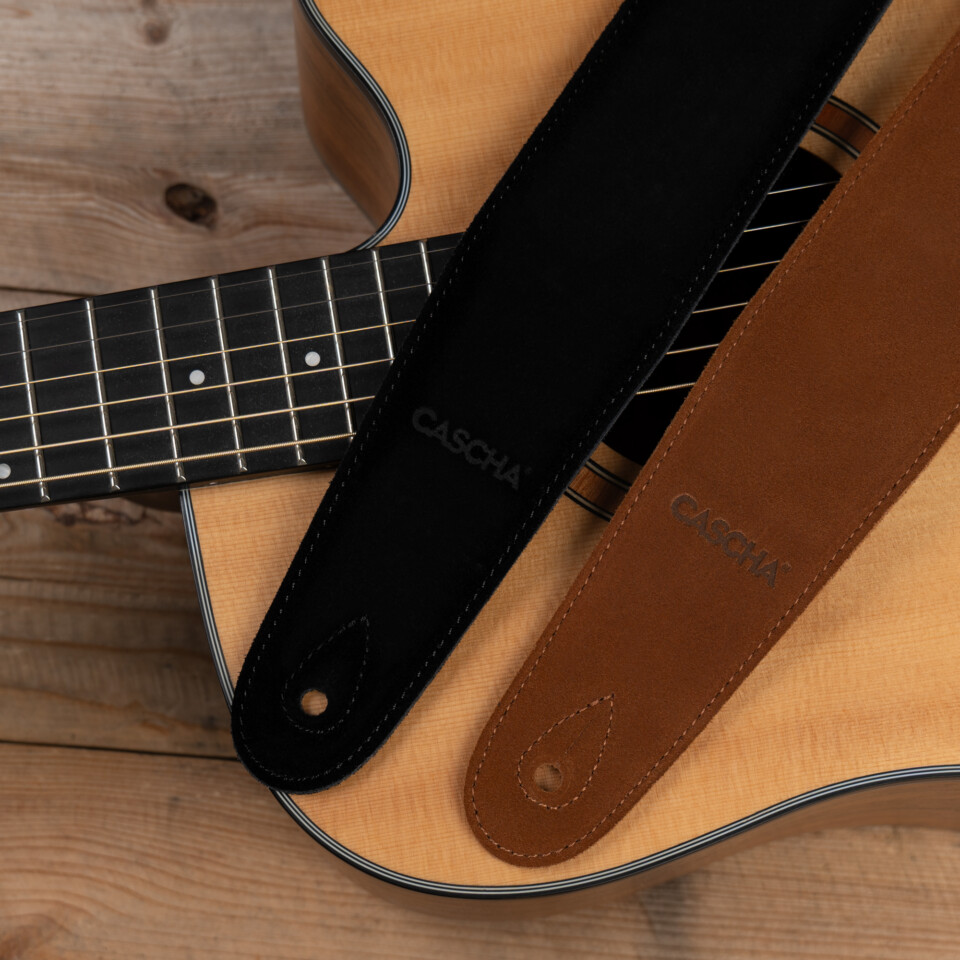 Entdecke den ultimativen Komfort und Stil mit unseren leicht gepolsterten Gitarrengurten aus Velours-Leder!