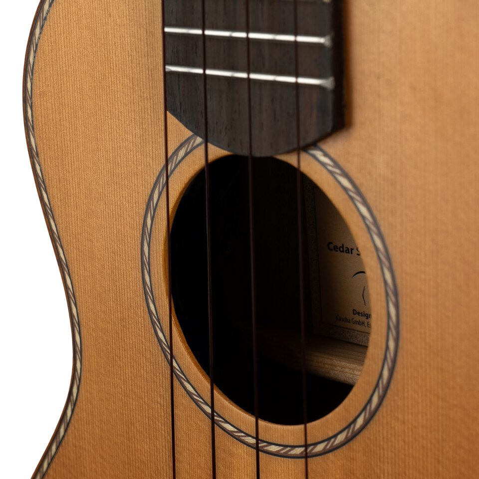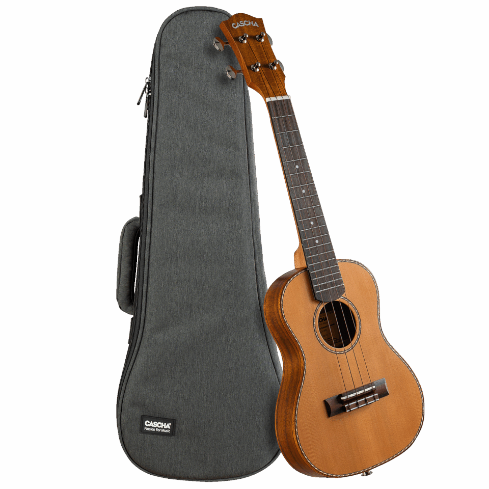 Einfach auspacken und Spaß haben. Die Ukulele ist ein geniales Instrument. Sie ist handlich, klein und einfach zu erlernen. Diese Konzert Ukulele überzeugt durch ihre hohe Qualität und die hervorragenden Klangeigenschaften der verwendeten Klanghölzer. Dank der präzisen, offenen Stimmmechaniken und den exzellent klingenden Fluorocarbon-Saiten hält sie ihre Stimmung immer perfekt. An den vorhandenen Gurtpins lässt sich schnell und einfach ein Ukulele Gurt anbringen. Die Cascha Ukulele Cedar Solid Top ist sowohl für Einsteiger als auch für fortgeschrittene Spieler geeignet. Zum Lieferumfang dieses Sets gehören eine praktische 5mm gepolsterte Tragetasche.
