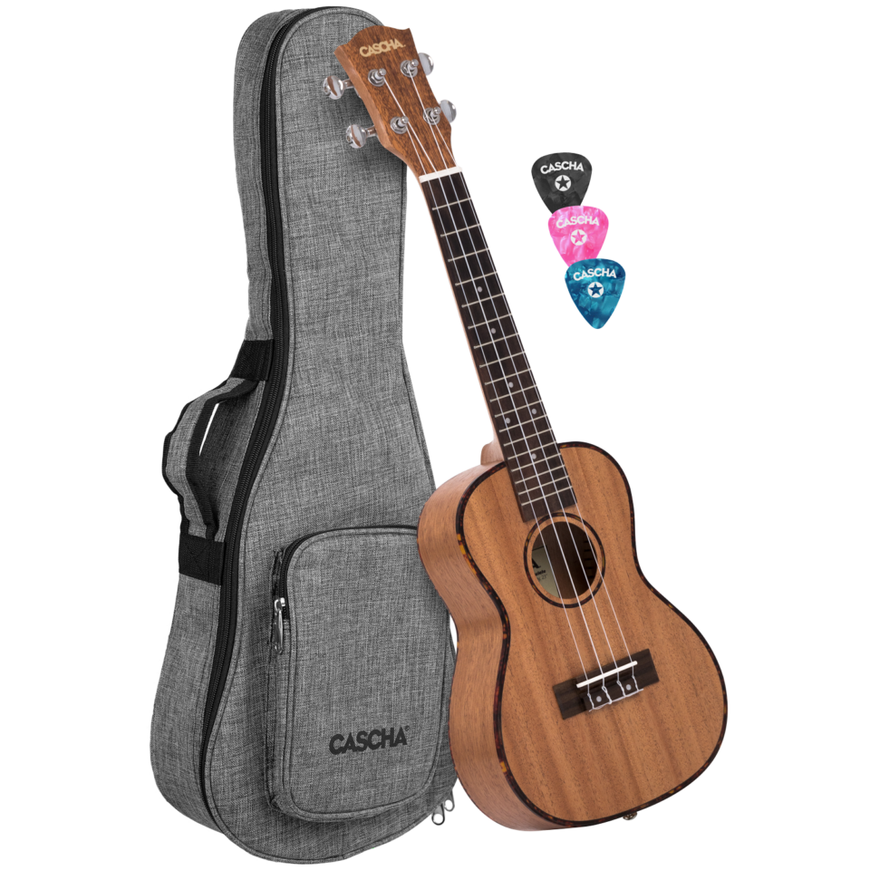 Einfach auspacken und Spaß haben. Die Ukulele ist ein geniales Instrument. Sie ist handlich, klein und einfach zu erlernen. Diese Konzert Ukulele überzeugt durch ihre hohe Qualität und die hervorragenden Klangeigenschaften der verwendeten Klanghölzer. Dank der präzisen, gekapselten Stimmmechaniken und den exzellent klingenden Aquila Marken-Nylon-Saiten hält sie ihre Stimmung immer perfekt. An den vorhandenen Gurtpins lässt sich schnell und einfach ein Ukulele Gurt anbringen. Die Cascha Premium Ukulele ist sowohl für Einsteiger als auch für fortgeschrittene Spieler geeignet. Zum Lieferumfang dieses Sets gehören eine praktische 5mm gepolsterte Tragetasche und 3 Plektren.
