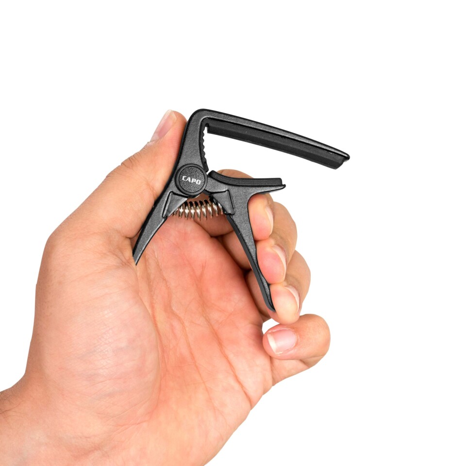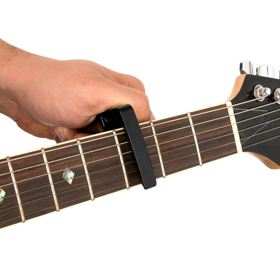 Ein Kapodaster ist ein unersetzliches Hilfsmittel für jeden Gitarristen. Mit ihm kann man z.B. die Tonhöhe der Gitarre an die Stimmlage eines Sängers anpassen, ohne den Einsatz komplizierter Barrégriffe. Damit der Kapodaster gut funktioniert, müssen Qualität und Bauweise stimmen, so wie beim Cascha Capo. Seine hochwertige Feder aus Qualitätsstahl sorgt mit otpimalem Druck für brillante Töne und eine perfekte Intonation beim Spielen. Die stabile Metallkonstruktion sitzt in jeder Lage perfekt und ist an den Auflageflächen mit Silikon beschichtet. So werden Hals und Saiten der Gitarre perfekt geschützt. Das Cascha Capo lässt sich mit nur einer Hand schnell und einfach anbringen und wieder abnehmen. Dieses Modell ist für Western- und E-Gitarren geeignet.