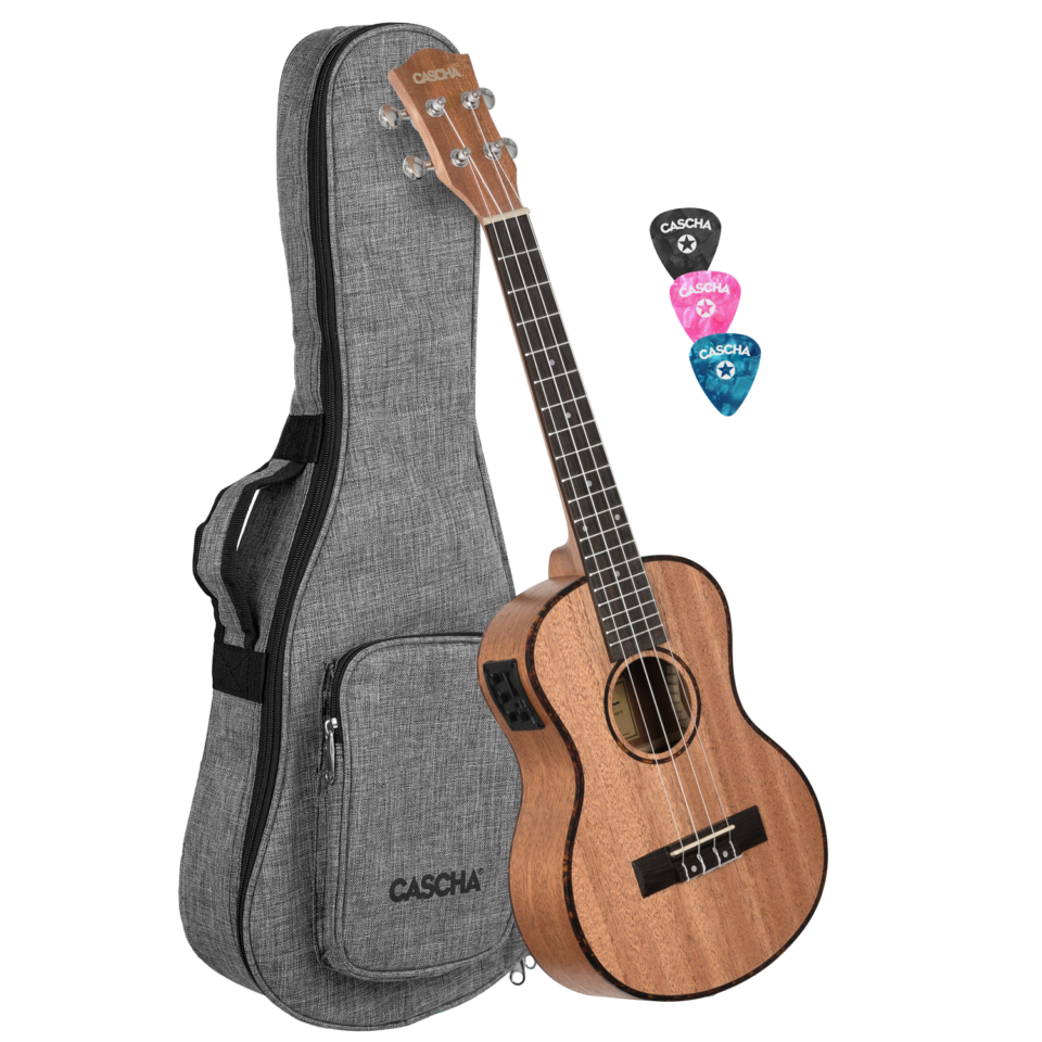 Einfach auspacken und Spaß haben. Die Ukulele ist ein geniales Instrument. Sie ist handlich, klein und einfach zu erlernen. Diese Tenor Ukulele überzeugt durch ihre hohe Qualität und die hervorragenden Klangeigenschaften der verwendeten Hölzer. Der Mahagoni-Korpus sorgt hierbei für einen ausgewogenen, klaren und warmen Sound. Dank der präzisen, gekapselten Stimmmechaniken und den exzellent klingenden Aquila Marken-Nylon-Saiten hält sie ihre Stimmung immer perfekt. Das aktive PIEZO-Tonabnehmersystem mit integriertem Stimmgerät und 3-Band-Equalizer macht die CASCHA Ukulele auch auf der Bühne zum perfekten Begleiter. An den vorhandenen Gurtpins lässt sich schnell und einfach ein Ukulele Gurt anbringen. Die CASCHA Premium Ukulele ist sowohl für Einsteiger als auch für fortgeschrittene Spieler geeignet. Zum Lieferumfang dieses Sets gehören eine praktische 5 mm gepolsterte Tragetasche und 3 Plektren.