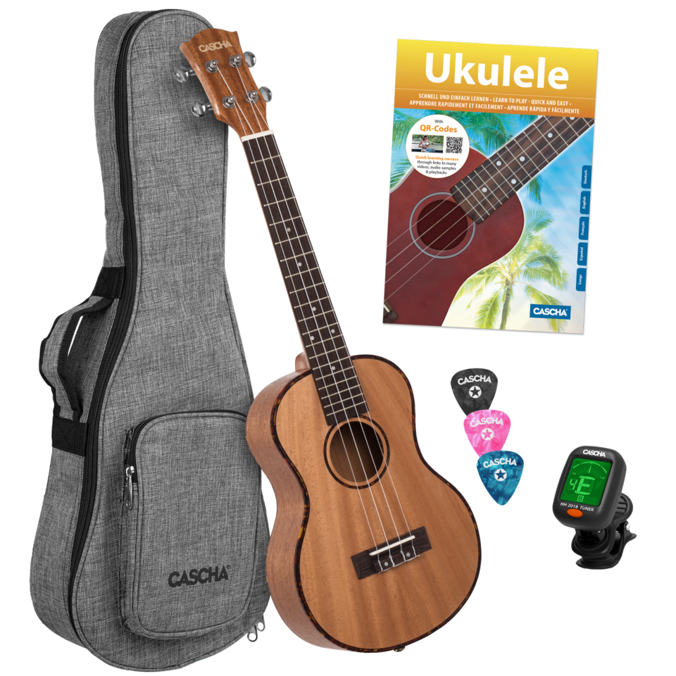 Einfach auspacken und Spaß haben. Dieses Bundle enthält alles, was man zum Ukulele spielen braucht. Die Tenor Ukulele überzeugt durch ihre hohe Qualität und die hervorragenden Klangeigenschaften der verwendeten Hölzer. Der Mahagoni-Korpus sorgt hierbei für einen ausgewogenen, klaren und warmen Sound. Dank der präzisen, gekapselten Stimmmechaniken und den exzellent klingenden Aquila Marken-Nylon-Saiten hält sie ihre Stimmung immer perfekt. An den vorhandenen Gurtpins lässt sich schnell und einfach ein Ukulele Gurt anbringen. Die CASCHA Premium Ukulele ist sowohl für Einsteiger als auch für fortgeschrittene Spieler geeignet. Zum Lieferumfang dieses Bundles gehören eine 5mm gepolsterte Tragetasche, 3 Plektren, ein praktisches Stimmgerät und die 4-sprachige Ukulelenschule „Ukulele – Schnell und einfach lernen“ in Deutsch, Englisch, Französisch und Spanisch.
