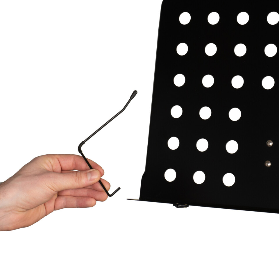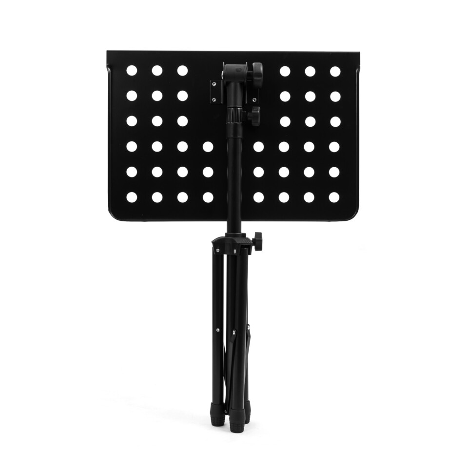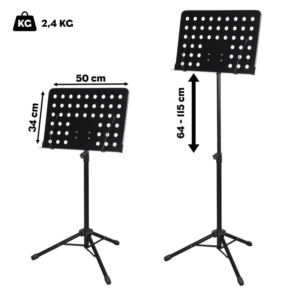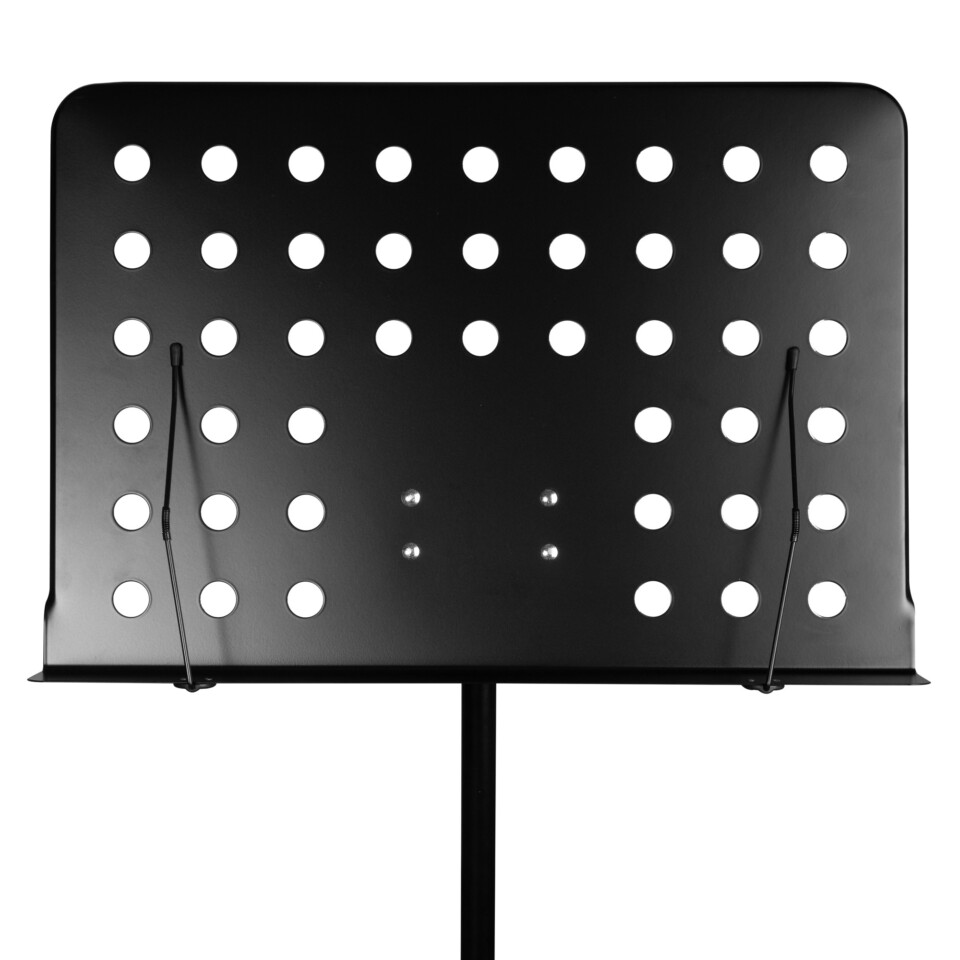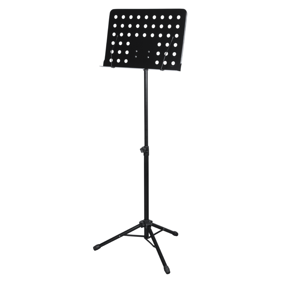 Für die meisten Musiker ist ein Notenständer unverzichtbar. Wenn man mehr Platz für Noten braucht und es insgesamt komfortabler mag, greift man zu einem Orchesterpult. Das Cascha Orchesterpult besteht aus Metall und ist schwarz lackiert. Die Fußstützen besitzen zusätzliche Stützstreben zur Stabilisierung. Die Höhe des Pults lässt sich von 64 cm bis 115 cm verstellen. Es ist mit griffigen Schrauben ausgestattet und ausziehbar. So lässt es sich perfekt auf die jeweilige Körperhöhe anpassen, egal ob man im Sitzen oder Stehen spielt. Die Notenauflage besteht aus einer gelochten Platte mit den Maßen 50 x 34 cm. Sie ist im Neigungswinkel einstellbar, abnehmnar und bietet mehr Platz für Notenblätter und Bücher als normale Notenständer. Die eingebauten Notenklemmen sorgen für einen sicheren Halt und verhindern das Herunterfallen der Noten. Nach Bedarf können die Klemmfedern entfernt werden. Das Orchesterpult lässt sich kinderleicht ab- und schnell wieder aufbauen.