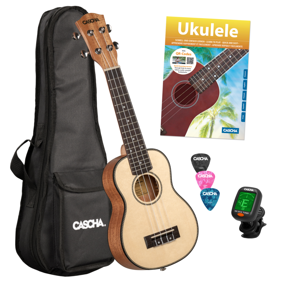 Zum Lieferumfang dieses Bundles gehören eine 5 mm gepolsterte Tragetasche, 3 Plektren, ein praktisches Stimmgerät und die 4-sprachige Ukulelenschule „Ukulele – Schnell und einfach lernen“ in Deutsch, Englisch, Französisch und Spanisch.