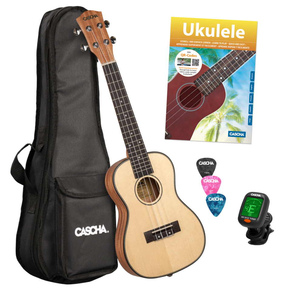 Zum Lieferumfang dieses Bundles gehören eine 5 mm gepolsterte Tragetasche, 3 Plektren, ein praktisches Stimmgerät und die 4-sprachige Ukulelenschule „Ukulele – Schnell und einfach lernen“ in Deutsch, Englisch, Französisch und Spanisch.