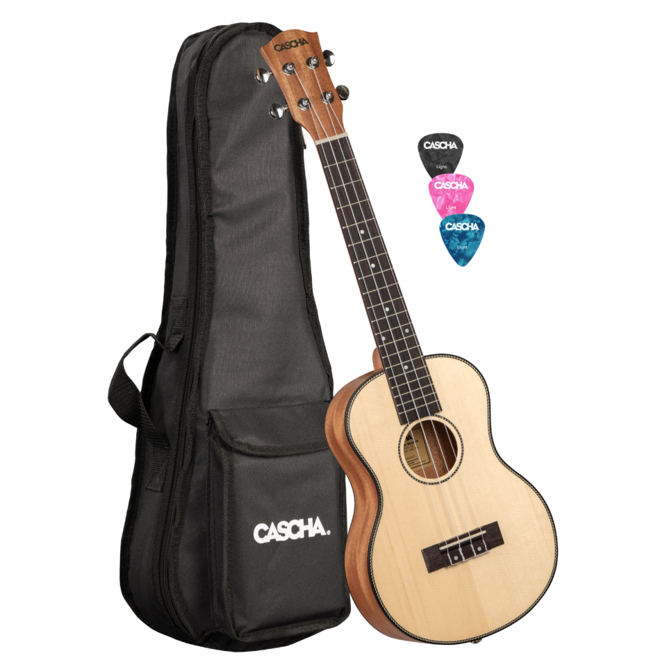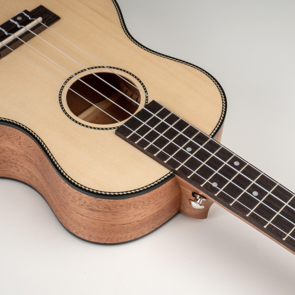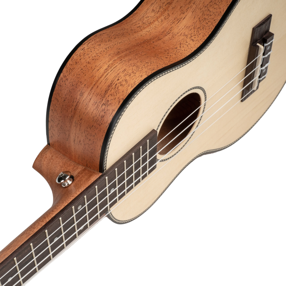 Die Solid Top Ukulele überzeugt sofort von Anfang an durch die sehr gute Verarbeitung. Die Decke besteht aus massivem Fichtenholz. Die schöne und gleichmäßige Maserung ist dabei nicht nur ein optisches Highlight. Als Deckenholz für Ukulelen und akustische Gitarren sorgt Fichte für einen vollen Klang und ein kraftvolles Feedback. Da es etwas weicher ist, überträgt es Schwingungen leichter. Das edle Matt-Finish wurde speziell gewählt, um den Klang nicht zu beeinträchtigen. Die eingebauten Gurt Pins ermöglichen ein Anbringen von Ukulelegurten. Damit kann man den Komfort und die Beweglichkeit beim Spielen erhöhen.