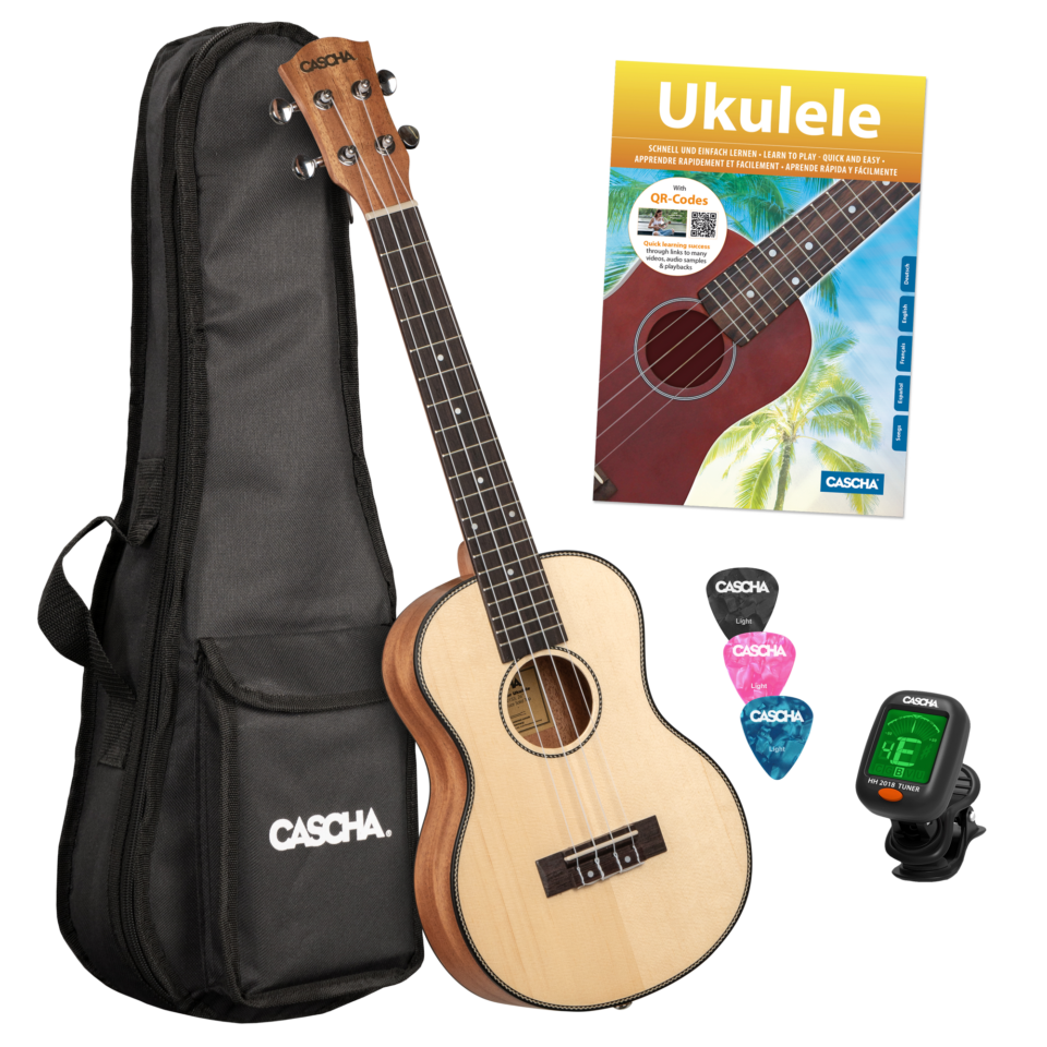 Zum Lieferumfang dieses Bundles gehören eine 5 mm gepolsterte Tragetasche, 3 Plektren, ein praktisches Stimmgerät und die 4-sprachige Ukulelenschule „Ukulele – Schnell und einfach lernen“ in Deutsch, Englisch, Französisch und Spanisch.