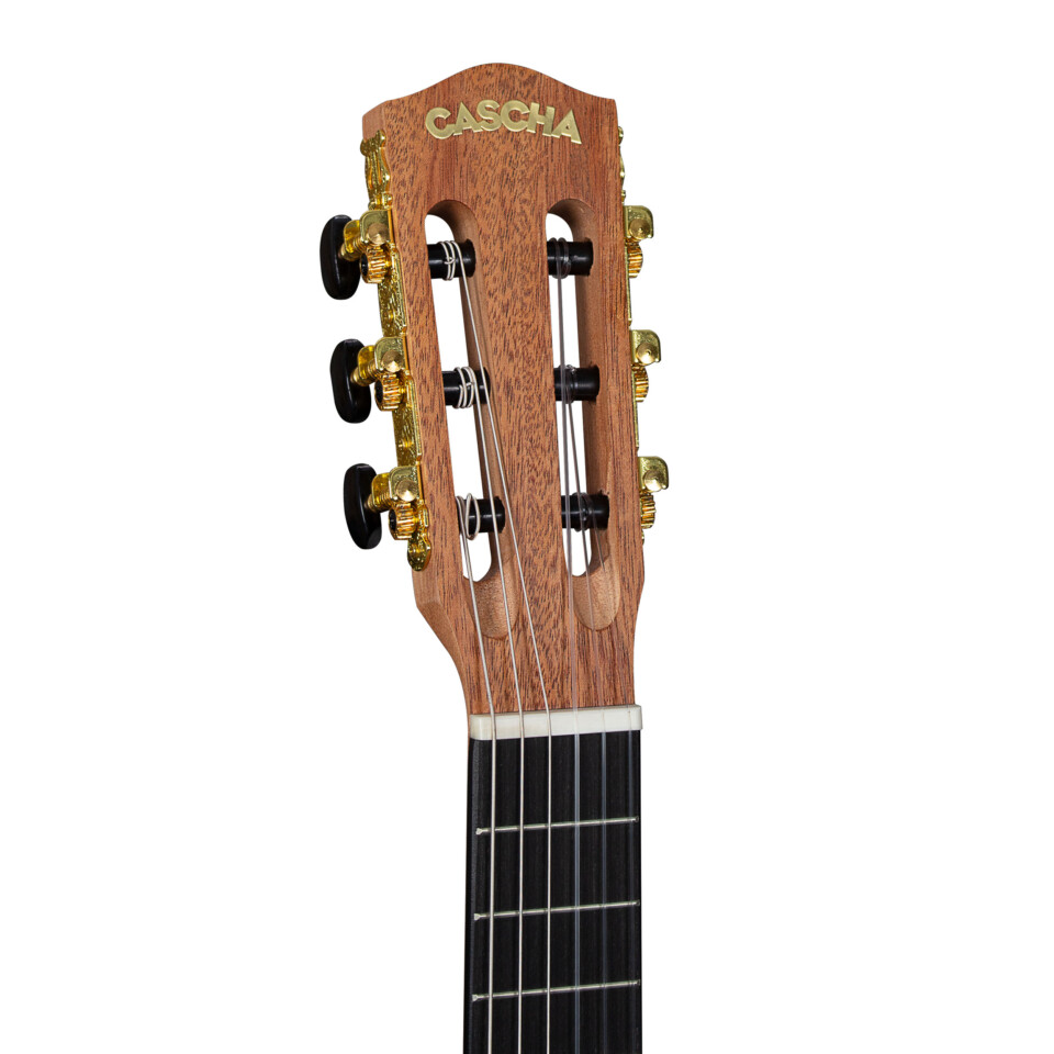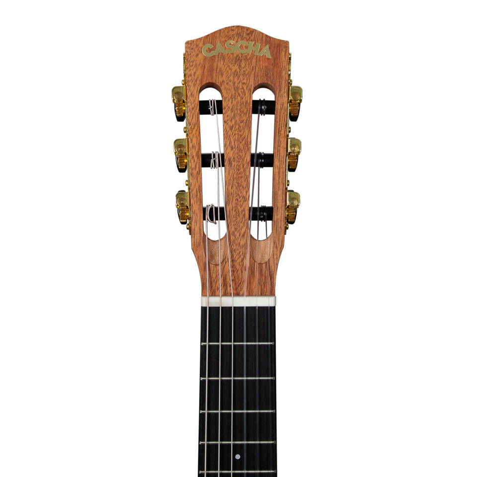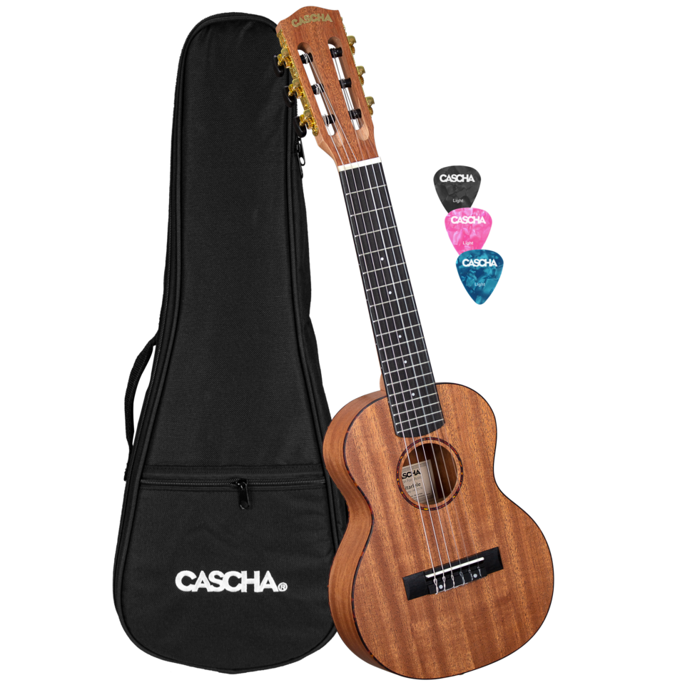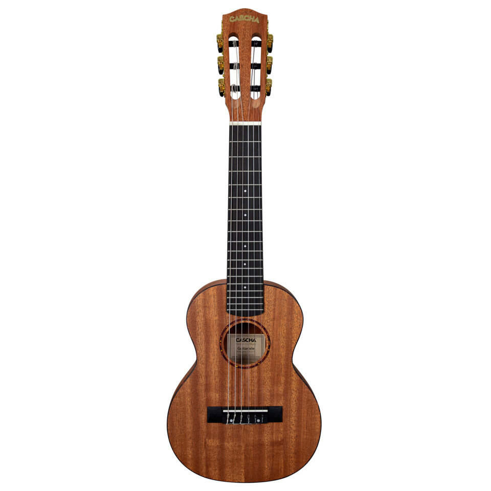 Die Cascha Guitarlele ist – wie der Name schon verrät – eine Mischform aus Gitarre und Ukulele. Rein optisch erinnert sie an eine Ukulele, sie besitzt aber sechs Saiten wie eine Standard-Gitarre und nicht nur vier (wie die Ukulele). Mit einer Gesamtlänge von 73 cm fällt sie etwas größer als die typische Tenorukulele aus. Die Mensur von 43 cm entspricht der einer 1/8-Konzertgitarre für Kinder, allerdings wird die Guitarlele anders gestimmt – und zwar eine Quinte höher. Durch das Tuning auf A-D-G-C-E-A ergibt sich auch ein deutlich höherer Klang, der für das typisch hawaiianische Flair einer Ukulele sorgt.