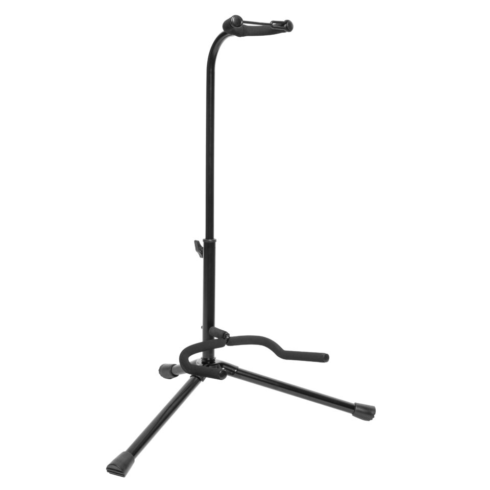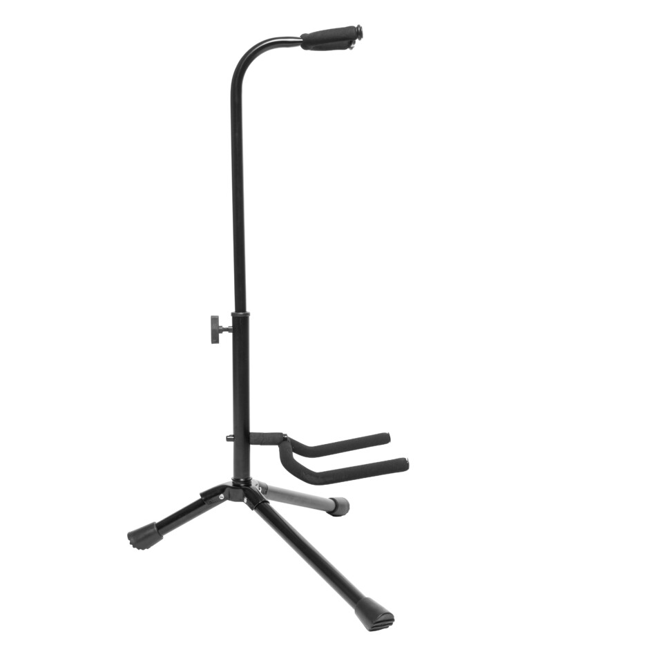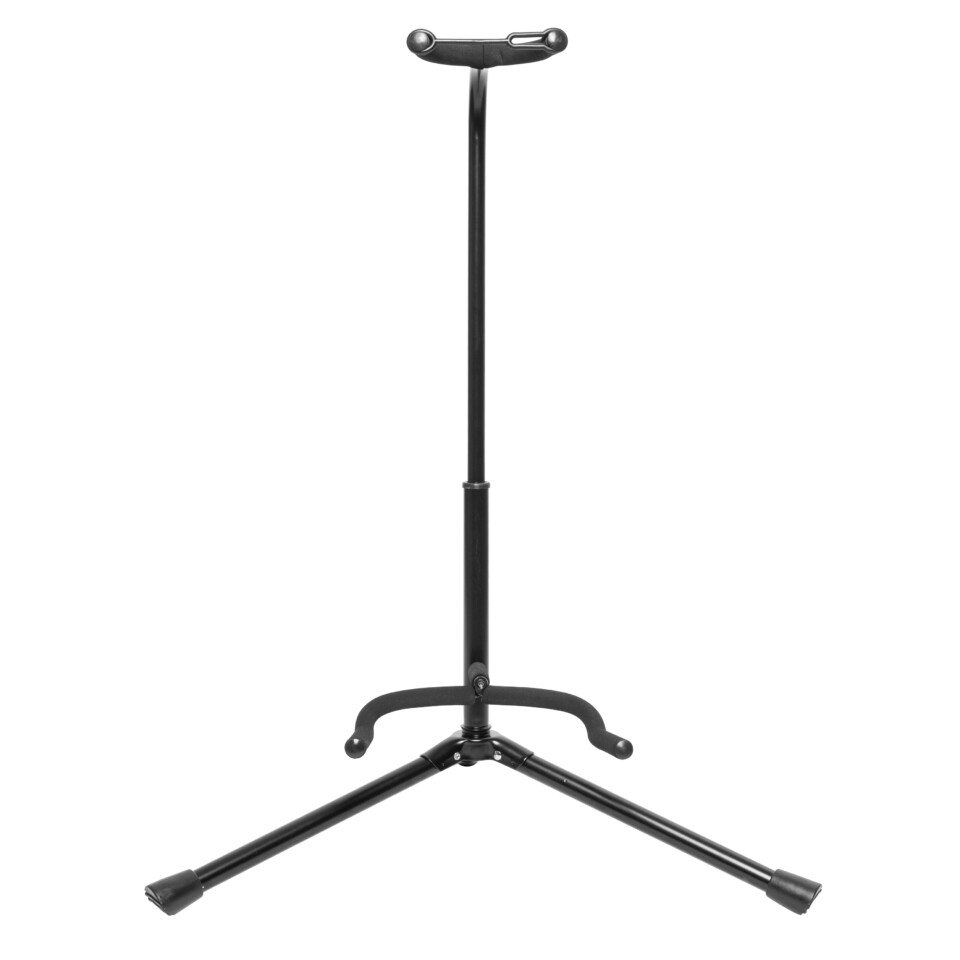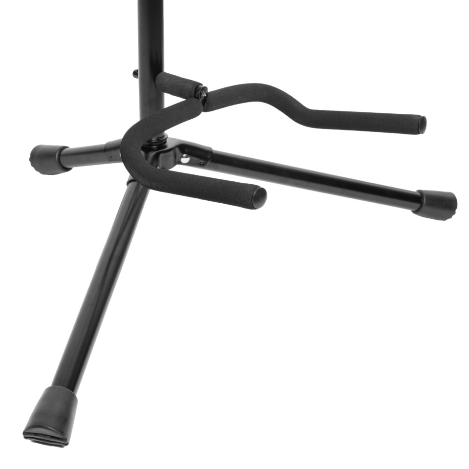 Der Gitarrenständer besteht aus haltbarem Metall. Die drei Beine mit rutschfesten Gummifüßen sorgen für einen stabilen Stand. Die Gitarren-Auflageflächen aus EVA Schaumstoff verhindern das Verkratzen des Instruments. Zudem bleibt die Gitarre dadurch sicher an Ort und Stelle. Dieser Gitarrenständer mit Schwanenhals wurde für Akustik- und E-Gitarren entworfen. Durch das Gitarrenstativ wird eine maximale Standfestigkeit der Gitarre gewährleistet. Der Anti-Kipp Verschluss am oberen Ende des Stativs verhindert das Herausfallen der Gitarre aus dem Ständer.