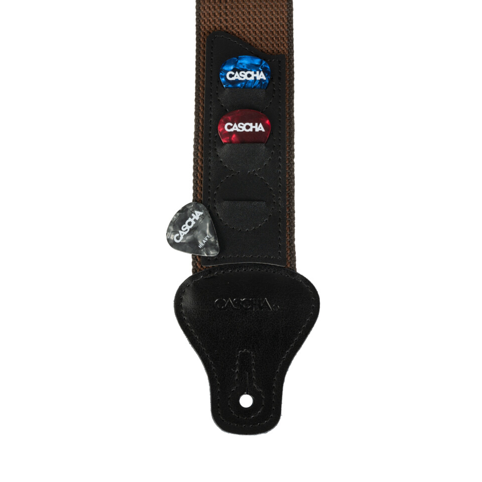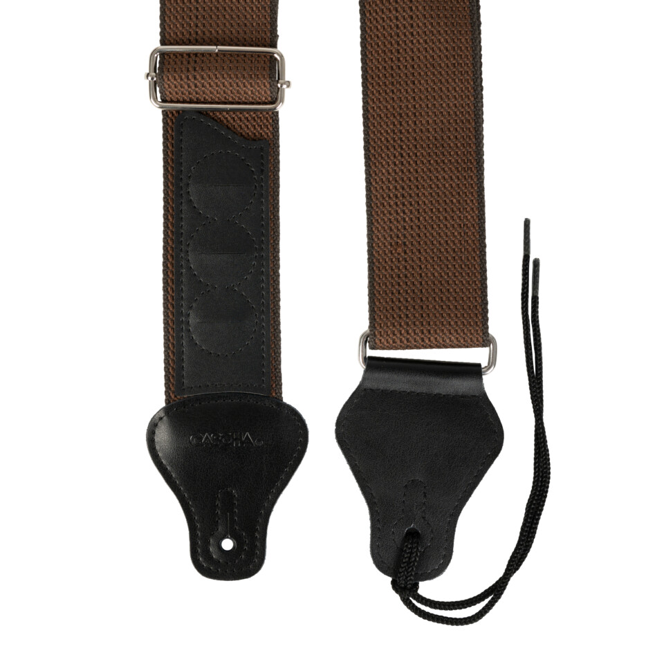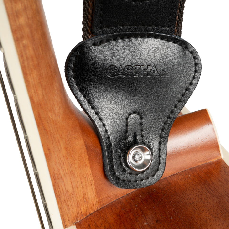 Der Cascha Gitarrengurt ist sehr leicht und besteht aus Polyester und weicher Baumwolle. Der Gurt überzeugt nicht nur durch die hochwertige Verarbeitung, sondern auch das zeitlose Design in klassischem Braun. Die Enden bestehen aus schwarzen Leder. Dies erhöht die Haltbarkeit.