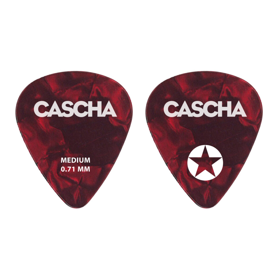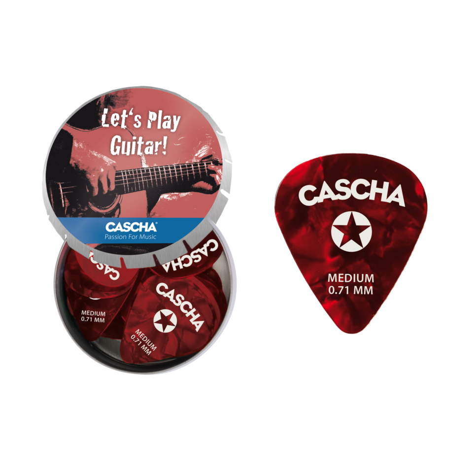 Die CASCHA Guitar Pick Box Medium beinhaltet 24 rote Plektren aus besonders abriebfestem Celluloid. Die Picks kommen in der Stärke medium (0,71 mm). Dadurch bist du bestens für jede Spieltechnik oder Musikrichtung ausgerüstet. Um die Pick Box zu öffnen musst du den Deckel in der Mitte drücken. Um sie zu schließen legst du den Deckel einfach wieder auf die Box und drückst ihn an den Seiten, bis sich dieser hörbar durch ein „Plop“-Geräusch schließt. Dabei ist zu beachten, dass sich noch genügend Luft in der Mitte der Metallbox befindet, damit du sie wieder aufkriegst.