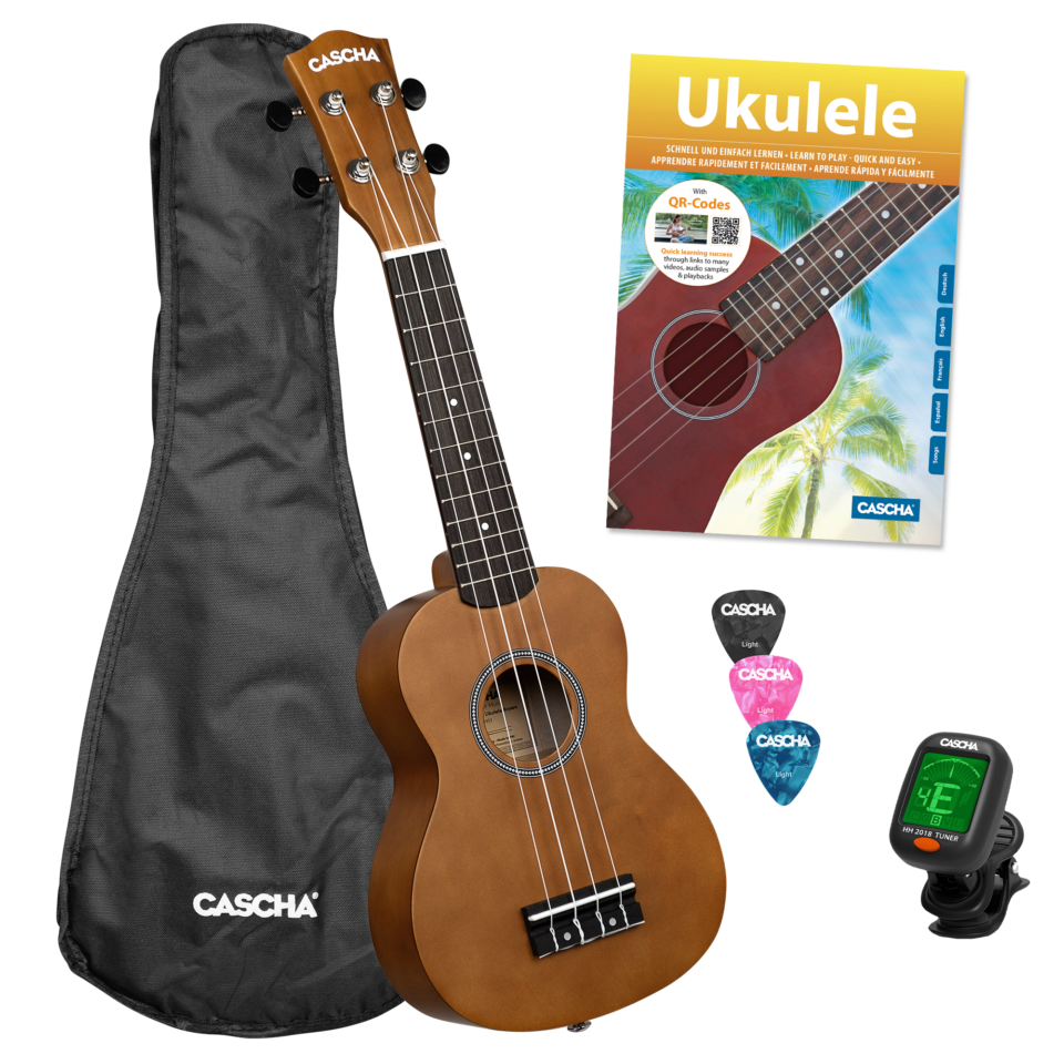 Einfach auspacken und Spaß haben. Die Ukulele ist ein geniales Instrument. Sie ist handlich, klein und einfach zu erlernen. Diese Sopran Ukulele ist durch ihre Qualität sowohl für Einsteiger als auch für fortgeschrittene Spieler geeignet. Sie verfügt über hervorragende Klangeigenschaften und lässt sich leicht spielen. Dank den präzisen Stimmmechaniken und den exzellent klingenden AQUILA Saiten aus Nylon hält sie ihre Stimmung immer perfekt. Zum Lieferumfang dieses Bundles gehören eine Tragetasche, 3 Plektren, ein praktisches Stimmgerät und die 4-sprachige Ukulelenschule „Ukulele – Schnell und einfach lernen“ in Deutsch, Englisch, Französisch und Spanisch.