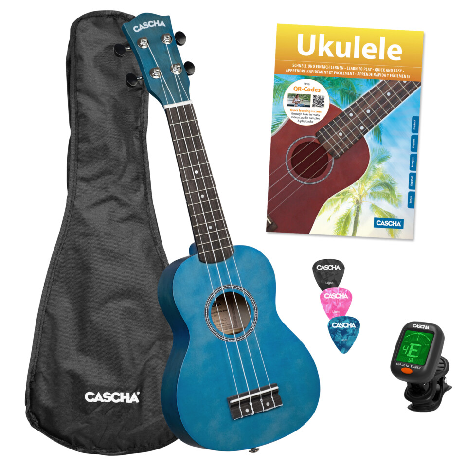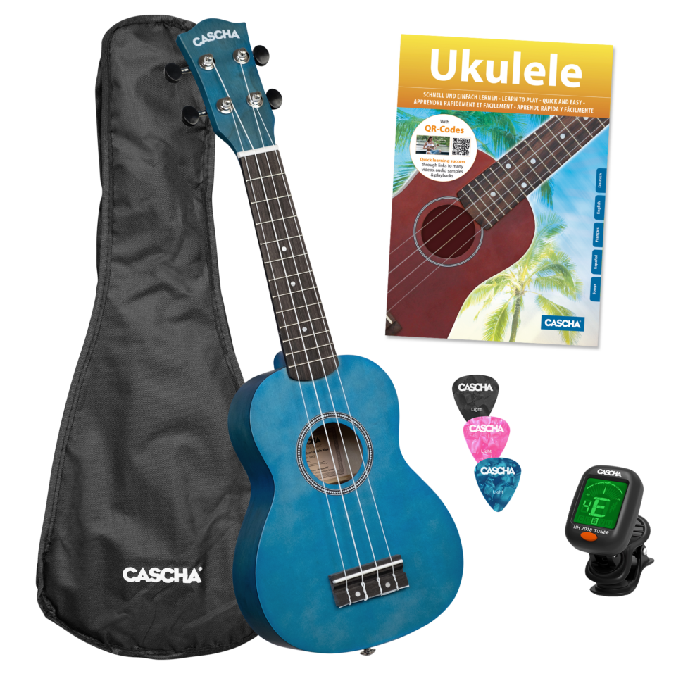 Zum Lieferumfang dieses Bundles gehören eine Tragetasche, 3 Plektren, ein praktisches Stimmgerät und die 4-sprachige Ukulelenschule „Ukulele – Schnell und einfach lernen“ in Deutsch, Englisch, Französisch und Spanisch mit Lernvideos über QR-Code.