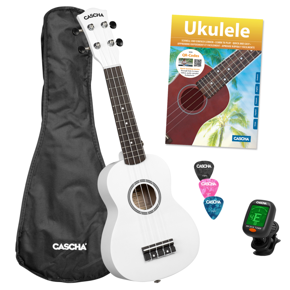 Zum Lieferumfang dieses Bundles gehören eine Tragetasche, 3 Plektren, ein praktisches Stimmgerät und die Ukulelenschule „Ukulele – Schnell und einfach lernen“ mit Lernvideos über QR-Code.