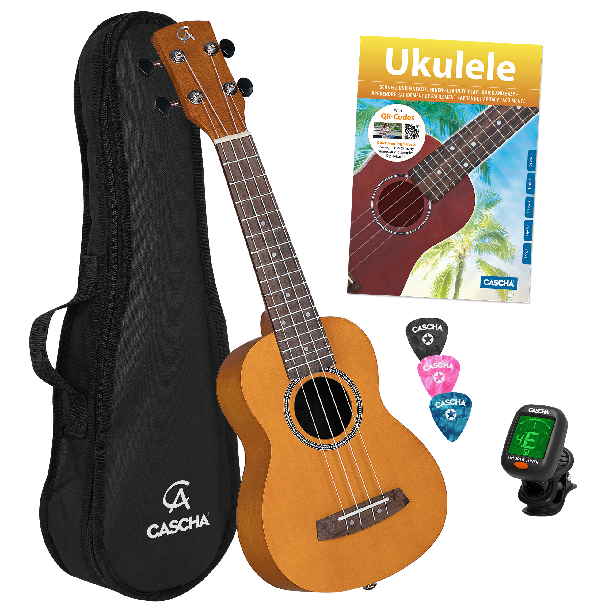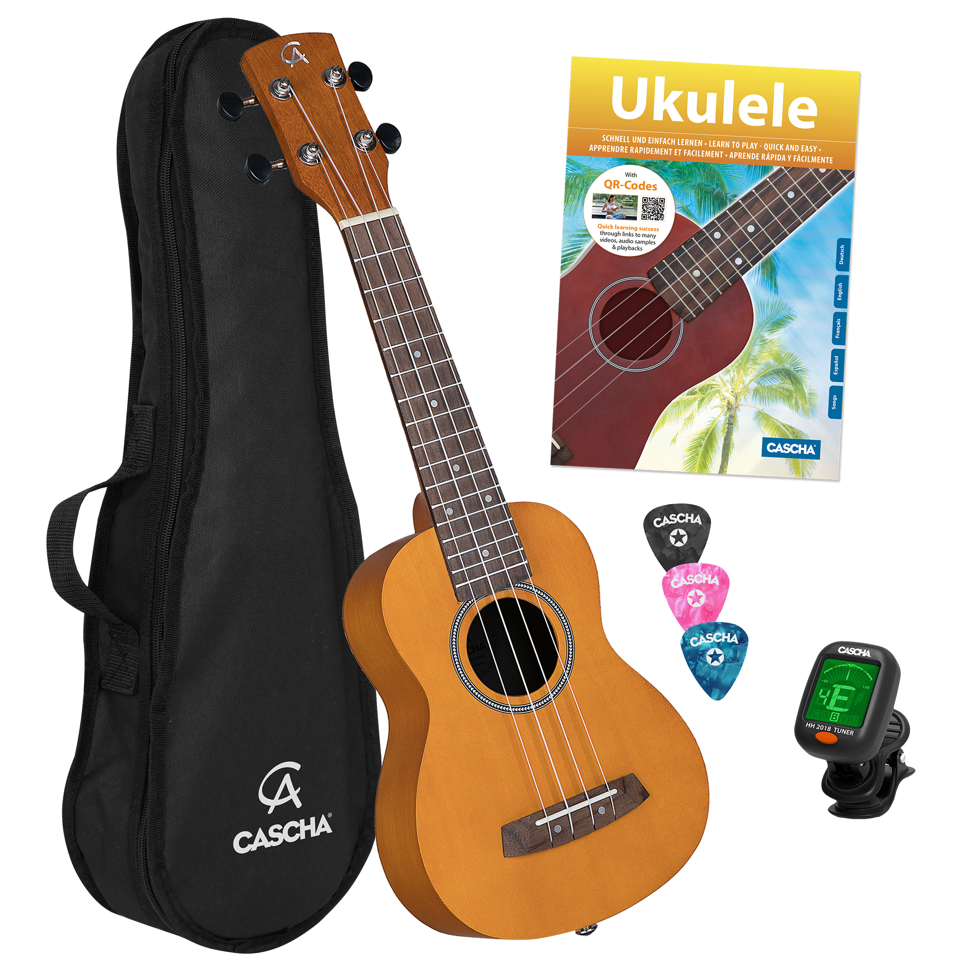 Zum Lieferumfang dieses Bundles gehören eine Tragetasche, 3 Plektren, ein praktisches Stimmgerät und die 4-sprachige Ukulelenschule „Ukulele – Schnell und einfach lernen“ in Deutsch, Englisch, Französisch und Spanisch mit Lernvideos über QR-Code.